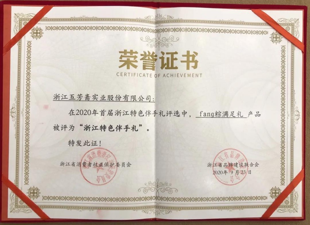 本次在首屆浙江特色伴手禮評選中,五芳齋的fang粽滿足禮經過了申報、初選、網上測評及專家評審的層層篩選,獲得了來自消費者和專家團隊的一致好評,也是對五芳齋一直以來工作的肯定。在未來的日子里,五芳齋將在在品質、工藝、保障三大方面繼續發力,力求為消費者帶來更好、更棒的美食體驗,成為文化特色濃、產品和服務質量優、品牌信譽高、市場競爭力強的百年老字號!