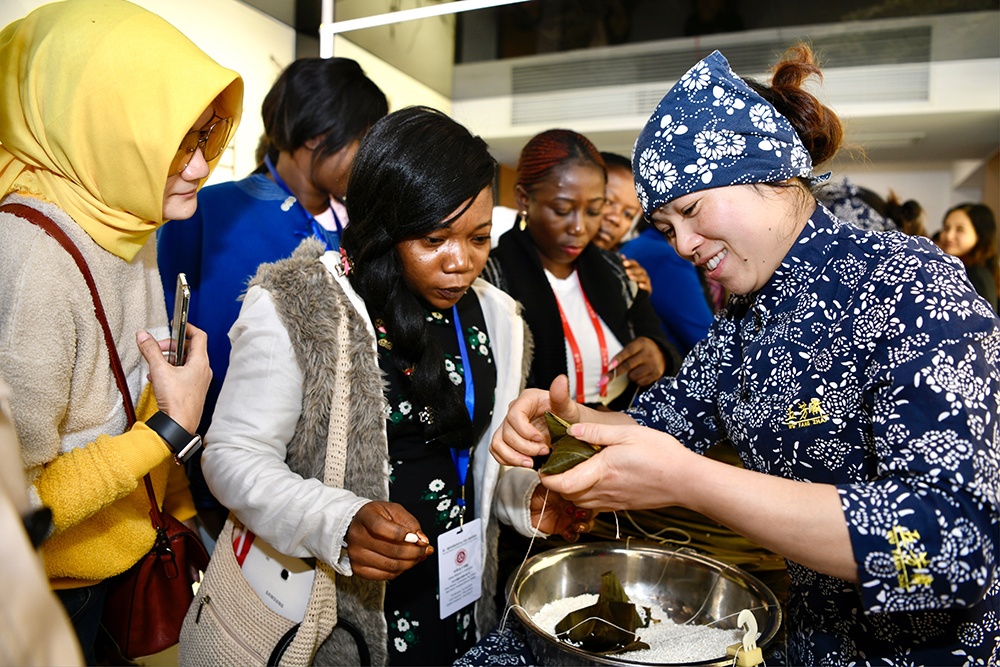 27位政黨婦女干部在中聯部國際交流中心劉亦淇、 中華女子學院國際合作處處長葉水平、省婦女干部學校副校長張武萍、嘉興市婦聯副主席陳敏紅的陪同下來到五芳齋產業園調研,五芳齋黨委副書記、工會主席王偉帶領參觀了粽藝長廊,感受五芳齋粽子獨特的制作工藝。看到裹粽工人們的驚人速度外賓們贊嘆不已,紛紛拿起手機拍攝留念。來到粽藝長廊展示廳外賓們在裹粽師傅的指導下,擼起衣袖學習裹粽技藝足足體驗了一把。五芳齋產業園作為此行的參觀點,讓外賓們近距離了解五芳齋粽子的生產過程,同時也讓她們領略到中國傳統文化的濃濃氛圍,為交流活動增添了色彩。